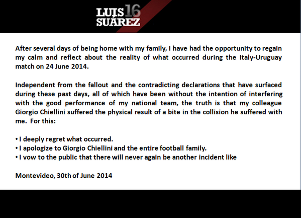 Translation: I’m heading to Barcelona. They’re making me apologise first. RT @luis16suarez My apologies to Chiellini: http://t.co/vmengl24kW