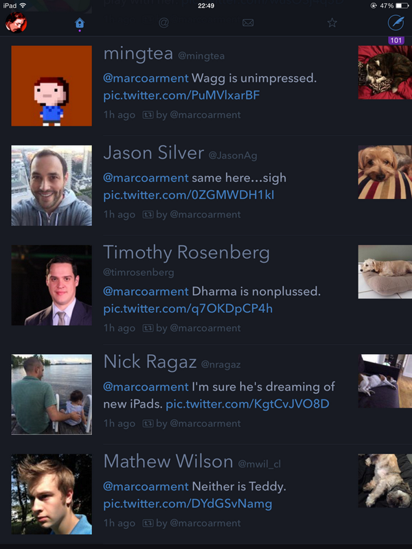 Best part of the Apple Keynote was my stream being overrun by bored dogs thanks to @marcoarment, haha: http://t.co/n3VX4foqTm
